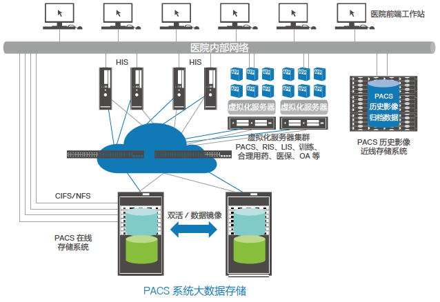 高速調(diào)用影像:采用 SAN+NAS 存儲(chǔ)作為核心存儲(chǔ),存儲(chǔ) PACS 系統(tǒng)數(shù)據(jù)庫(kù)和在線的 PACS影像文件,提供高速的數(shù)據(jù)訪問(wèn)能力;